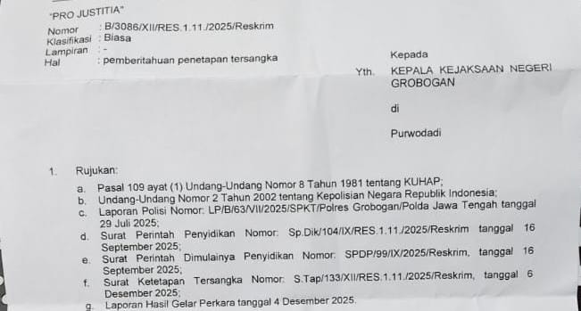 Penyidik juga telah berkirim surat Nomor: B/3086/XII/RES 1.11/2025/Reskrim, tanggal 6 Desember 2025, tentang Pemberitahuan Penetapan Tersangka, kepada Kejaksaan Negeri Grobogan.